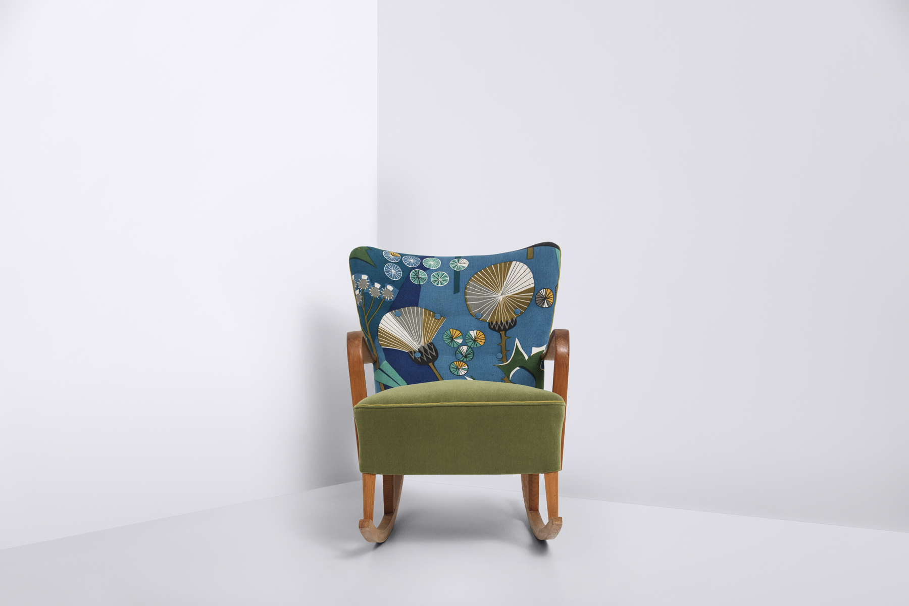 Floral upholstery by Dagmar Loden produced by Jobs Handtryck. Green velvet upholstery by Kvadrat.