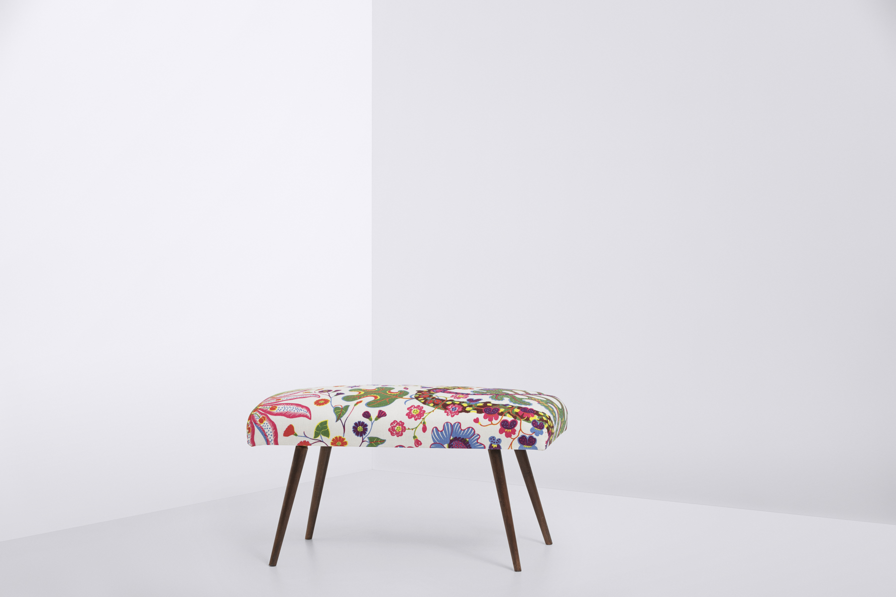 German produced bench, 1950s. Upholstered with floral “Brazil textile” by Josef Frank