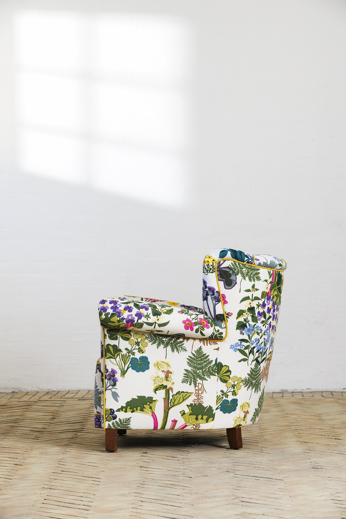 EEN chair reupholstered in fabric from Gocken Jobs ‘Rabarber’
