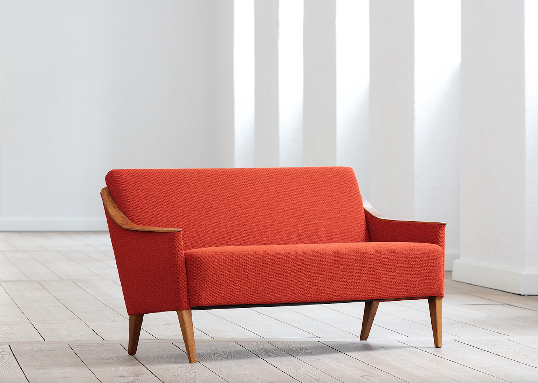 Scandinavian produced sofa redressed in red/orange wool fra Kvadrat Textiles
